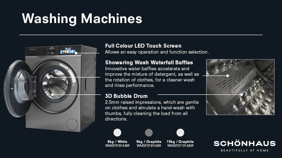 Schönhaus has equipped the WMSF01914AG with fantastic technology to revolutionise your laundry routine. The 3D Bubble drum simulates a hand wash motion, enhancing cleaning performance while being gentle on your clothes.